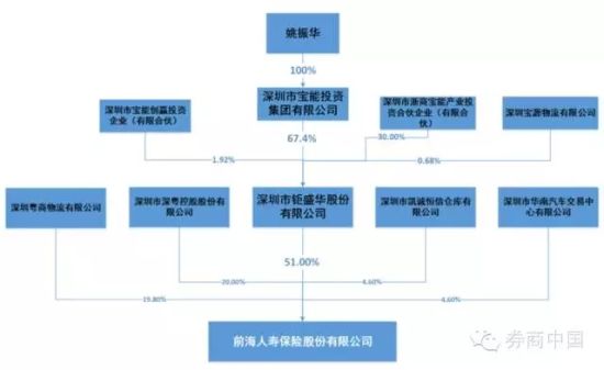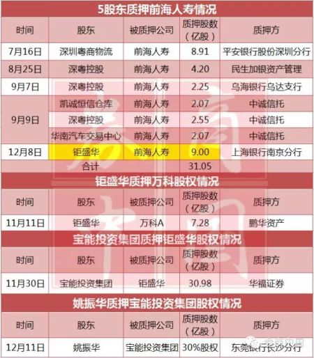 【相关阅读】9家机构+4路杠杆助攻夺万科 钱从何来? “钱从何来”再露端倪:宝能系连环股权质押链条浮现水面 在对万科A(21.08, 1.00, 4.98%)的举牌投资中,宝能系中的钜盛华灵活运用了多路杠杆资金,从而提高了资金运作效率,但随着前海人寿的股权质押信息被发现,宝能系中一个复杂的连环股权质押链条开始浮现水面。 据券商中国记者梳理,宝能系目前至少涉及3层股权治质押,简单来说,钜盛华质押了万科7.28亿股、宝能投资集团质押了钜盛华30.98亿股、姚振华在12月11日又质押了宝能投资集团30%股权。此外,作为钜盛华举牌万科的一致行动人以及钜盛华的控股子公司,钜盛华在12月8日又质押了前海人寿9亿股。 工商信息公示系统显示,前海人寿从今年7月开始就开始遭遇股东质押股权,截至目前已经发生了7条股权质押记录,合计被5名股东质押31.05亿股,质押方包括5家公司。其中,深粤控股和粤商物流分别是前海人寿的的第二和第三大股东,持股比例达到20%和19%,它们曾在今年7月、8月和9月发生股权质押,两家合计分别质押了前海人寿的8.91亿股和9亿股,质押方包括平安银行(11.92, -0.15, -1.24%)深圳分行、民生加银资产管理公司、乌海银行乌达支行。 值得一提的是,钜盛华可以明确是宝能集团的成员之一,而随着钜盛华质押前海人寿的信息披露,这使得宝能集团内部的股权质押链条变得较为复杂。 首先是钜盛华质押了万科的股权。根据公告,钜盛华在11月11日时共持有万科股权9.26亿股,其中有7.28亿股质押给了鹏华资产,该部分股权占万科总股本的 6.59%,占当时钜盛华所有持股的78.62%,以质押起始日收盘价计算,这部分质押股权市值达到98.43亿元。 接下来是宝能投资集团质押了钜盛华股权。全国企业信用信息公示系统显示,钜盛华在11月30日有一条股权质押记录,具体为“股权质押:将深圳市宝能投资集团有限公司持有的309767.3151万股股份质押给华福证券有限责任公司。 随后是钜盛华质押了前海人寿股权。在此前举牌万科的过程中,钜盛华和前海人寿是一致行动人,两家对万科持股持股在12月7日达到20%的举牌线,其中由前海人寿直接持有万科6.66%股权。工商信息系统显示,在12月8日、也即对万科发起第四次举牌的次日,钜盛华将前海人寿9亿股质押给了上海银行南京分行。 最后是宝能系的掌门人姚振华在12月11日将宝能投资集团30%的股权质押给了东莞银行长沙分行。