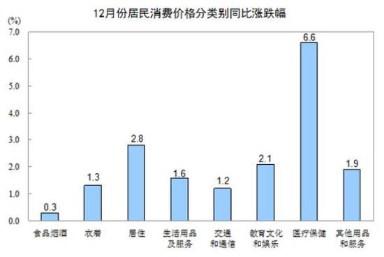 12月份,其他七大类价格同比均上涨。其中,医疗保健、居住、教育文化和娱乐价格分别上涨6.6%、2.8%和2.1%,其他用品和服务、生活用品及服务价格分别上涨1.9%和1.6%,衣着、交通和通信价格分别上涨1.3%和1.2%。