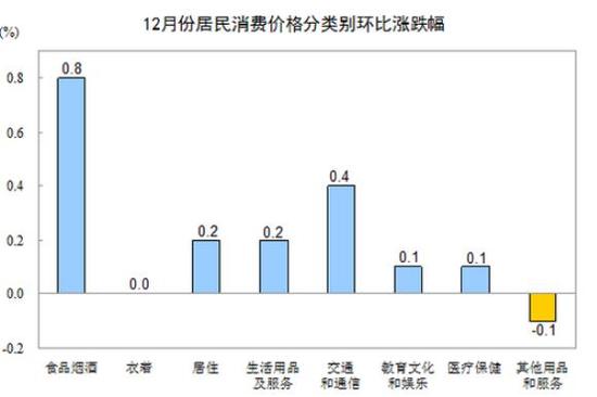 12月份,其他七大类价格环比五涨一降一平。其中,交通和通信价格上涨0.4%,居住、生活用品及服务价格均上涨0.2%,教育文化和娱乐、医疗保健价格均上涨0.1%;其他用品和服务价格下降0.1%;衣着价格持平。