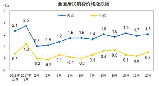 12月CPI同比上涨 1.8% 全年涨幅回落至1.6%